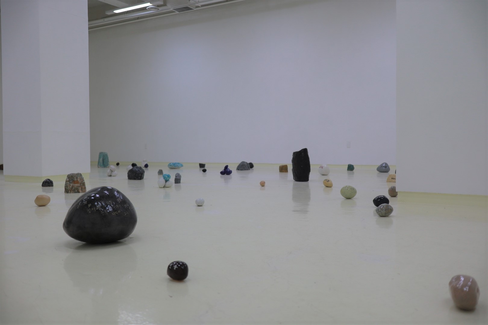 °ü¶÷°´Àº Àü½ÃÀå¿¡¼ µé¾î¼´Â ¼ø°£ºÎÅÍ °÷°÷¿¡ ÆîÃÄÀÖ´Â Àú¸¶´Ù ´Ù¸¥ Å©±â¿Í ÇüÅÂ, »ý»ó, ¹«´ÌÀÇ ¹ÙÀ§¿Í µ¹ ¿ÀºêÁ¦µé, ±×¸®°í ±×À§¿¡ ÀûÇôÀִ ģ¼÷Çϸ鼵µ ³¸¼± ´Ü¾îµéÀ» ¸¶ÁÖÇÏ°Ô µÉ °ÍÀÌ´Ù. º» Àü½Ã Á¦¸ñÀÌ °¡¸®Å°´Â ¹Ùó·³ 'µ¹ ±×¸®°í »õ°ÜÁø ´Ü¾îµé'À» ÇϳªÇϳª µé¿©´Ùº¸°í °¨»óÇÏ´Â µ¿¾È ÀÛ°¡°¡ µ¹ Çü»ó°ú ±× À§ÀÇ ±ÛÀÚ¸¦ ÅëÇØ ´ã¾Æ³»°íÀÚ ÇÑ ¸ðÁ¾ÀÇ ¹Ì½ÃÀûÀÎ ¿ª»ç¿Í ½Ã°£¼º , °¢ ¿ÀºêÁ¦ÀÇ ´Ùä·Î¿î °³ÀμºÀ» ÇѲ¯ »ó»óÇØº¸±æ ¹Ù¶õ´Ù.
