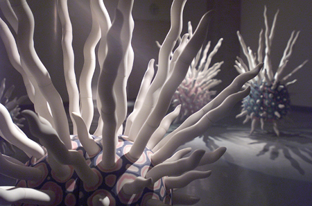 ¾ö¼ºµµ´Â ÀÌ·± ij½ºÆÃ °ø¹ýÀ» ¸Å°³·Î ÇÏ¿© ƯÀ¯ÀÇ Çü»óÀ» ºø¾î³½´Ù. °ø°£À» Á¡À¯Çϰí ÀÖ´Â ±× Çü»óµéÀº ºñÁ¤ÇüÀÇ ¿øÇüÀ» ¸öÅëÀ¸·Î ÇÏ¿© ±× Ç¥¸é¿¡ ¸¶Ä¡ ¿øÇü»ý¹°ÀÇ °¨°¢Ã˼ö¿Íµµ °°Àº ¹«¼öÇÑ µ¹±âµéÀÌ ³ª ÀÖ´Ù. ÀÌ·± ÇÏ¾á µ¹±âµé°ú ÇÔ²² ¸öÅëÀÇ Ç¥¸é¿¡´Â û»ö°ú ºÐÈ«»öÁ¶ÀÇ ¾ó·è ¹ÝÁ¡µéÀÌ ³ª ÀÖ¾î¼ ÇÑ´«¿¡µµ »ì¾ÆÀÖ´Â À¯±âü¸¦ ¿¬»ó½ÃŲ´Ù. ÀÌ´Â ¸¶Ä¡ ¿øÇü»ý¹°µéÀÌ ½Ã°£ÀÌ Á¤ÁöµÈ µí Á¤ÀûÀÎ ¾ÏÈæ ¼ÓÀ» À¯¿µÇϴ Ű÷Àû dz°æ°ú ´ë¸éÄÉ ÇÑ´Ù. ¸»ÇÏÀÚ¸é ±× ÀÚü Áß¼ºÀûÀÌ°í °¡Ä¡Á߸³ÀûÀÎ Àü½Ã°ø°£¿¡´Ù ƯÁ¤ÀÇ ¼º°ÝÀ» ºÎ¿©ÇÏ¿© À̸¦ ÀÏÁ¾ÀÇ »óȲÀû °ø°£ ȤÀº ¼»çÀû °ø°£À¸·Î º¯Çü½Ã۰í ÀÖ´Â °ÍÀÌ´Ù. ÀÌ·¯ÇÑ °ø°£Àû Á¡À¯¾ß¸»·Î Á¶Çü¿¹¼úÀÇ Áß¿äÇÑ ¹®¹ý Áß ÇϳªÀ̸ç, ÀÛ°¡´Â À̸¦ ÅëÇØ »ý¸íÀ» À×ÅÂÇϰí ÀÖ´Â ¿ìÁÖÀû Àڱà ¼ÓÀ¸·Î °ü°´À» ÀεµÇÑ´Ù. º¸±â¿¡ µû¶ó¼ µ¹±â Çü»óÀº ¸öÅë ³»ºÎ·ÎºÎÅÍÀÇ ¿¡³ÊÁöÀÇ ºÐÃâÀ̳ª ±âÀÇ ¹æÃâÀ» »ó±â½Ã۸ç, ÀÌ ¿ª½Ã ÀÛ°¡ÀÇ ÀÛ¾÷À» °üÅëÇÏ´Â ÁÖÁ¦ÀǽÄÀÎ »ý¸í ȤÀº »ý¸í·ÂÀÇ Ç¥Ãâ°ú ÅëÇÑ´Ù.